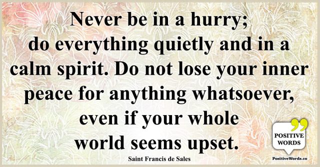 Never be in a hurry; do everything quietly and in a calm spirit. Do not lose your inner peace for anything whatsoever, even if your whole world seems upset.